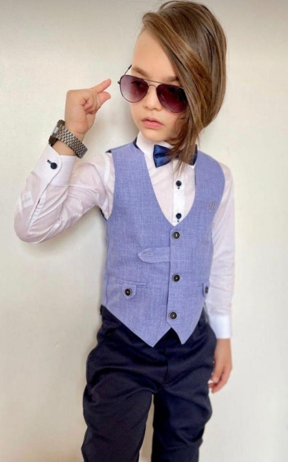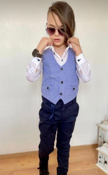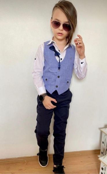 COLOR: BLUE SHIRT, TROUSERS, VEST, BOWL